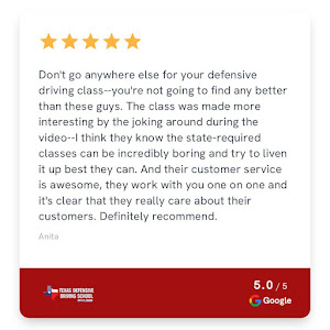 A Texan owned and operated online defensive driving school, Texas Defensive Driving School is a premier online defensive driving school recognized for its state-approved program. Perfect for those looking to dismiss traffic tickets or reduce insurance costs, our court-approved course is tailored to Texas state laws, offering a comprehensive driving education across major cities including Dallas, Houston, and Austin. At just $25, our video-based course is designed to be fast, fun, and user-friendly. With instant electronic certification and options for quick document delivery, our course is a reliable choice for driver improvement, making us a top-ranked Texas defensive driving school.